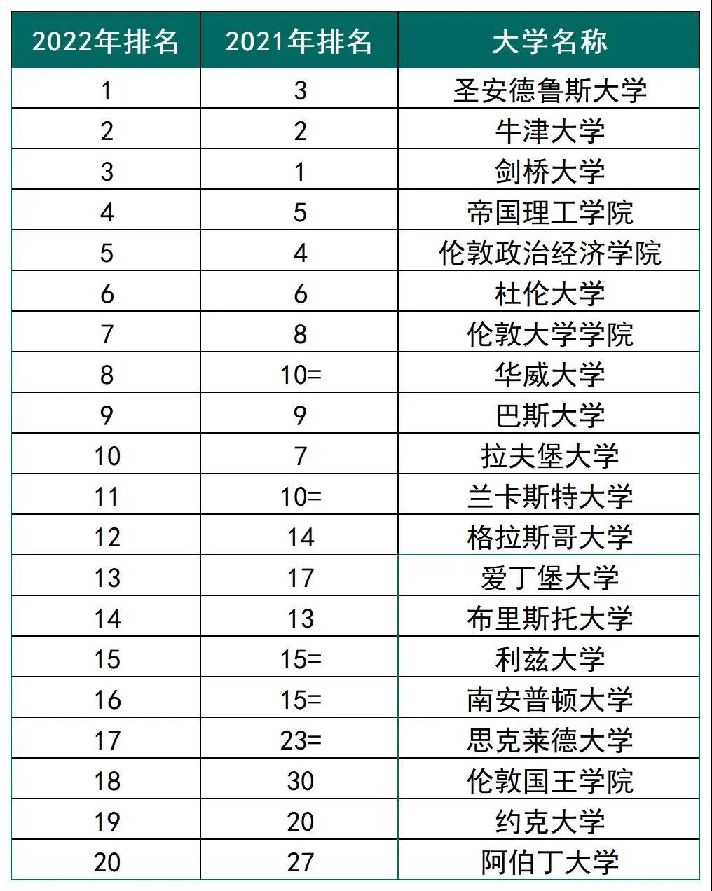 2021年10月8日前后,TIMES(The Times and The Sunday Times Good University Guide)发布了2022年英国大学排名。