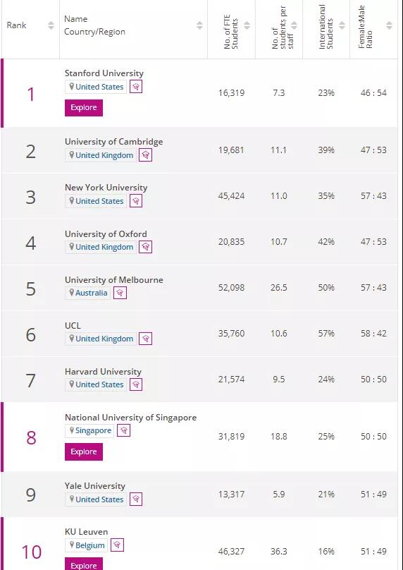 在前10名中有三所新入帮学校:澳大利亚的墨尔本大学(排名第5),新加坡国立大学(排名第8),而鲁汶大学则排名第10。