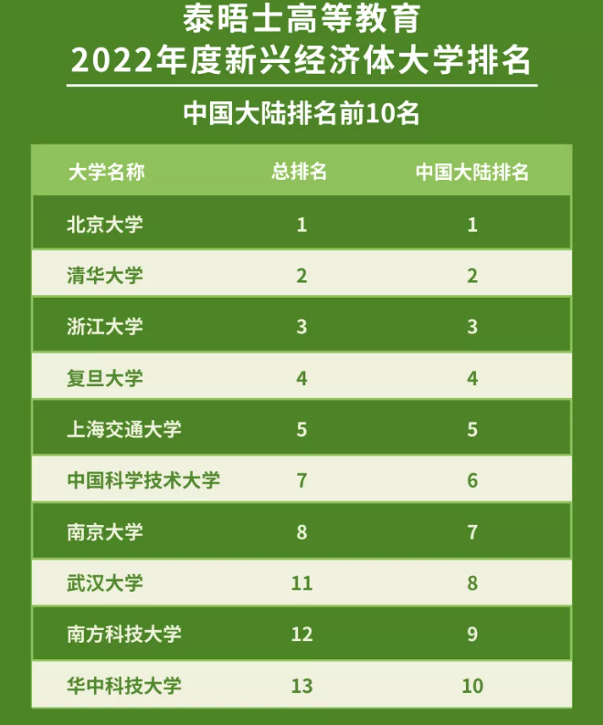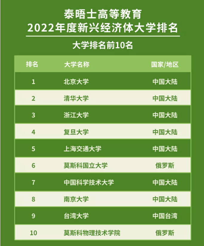 2022年度泰晤士高等教育新兴经济体大学排名