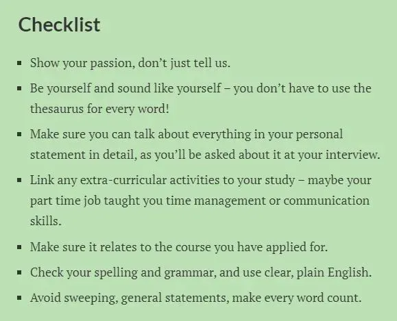剑桥大学官方在本科文书 写作指南中表示,他们想了解的是学生的申请原因、学术兴趣与热情,以便大学最终评估你是否适合所申请的课程!剑桥在官网也给出了PS写作要点清单: