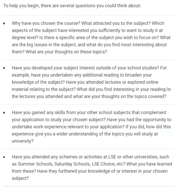 伦敦政治经济学院(以下简称LSE)不对学生进行面试,所以文书是突出自己学术优点与专业热情的重要桥梁。LSE 建议本科申请者的PS需要描述你对该专业的兴趣、理解和适用性,以及你在研究生阶段学习的目的和目标。在你的个人陈述中,希望可以讨论以下问题: