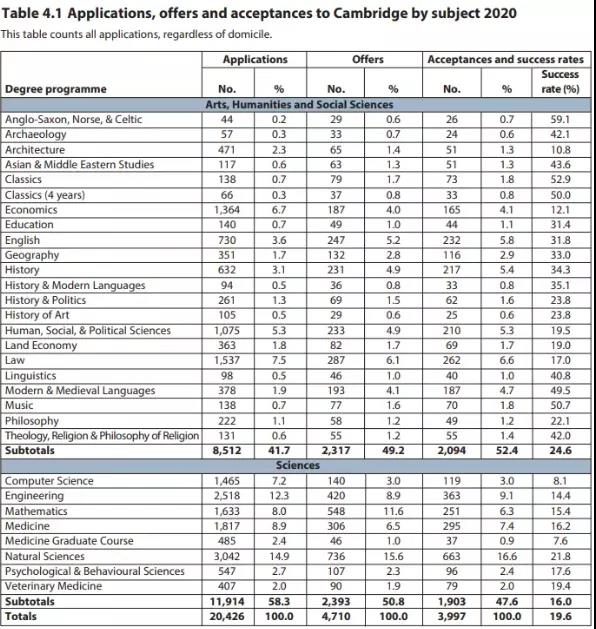 根据剑桥大学发布的最新本科录取数据报告,可以发现,在偏文科类的专业中,申请人数最多的五个专业分别是法律,经济,人文社会与政治,英语和历史。而偏理工科类的专业中,自然科学,工程,医学,数学和计算机竞争异常激烈。