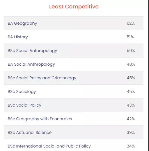 相较于商科、经济这种热门专业,文科类专业压力略小一些。根据LSE 发布的Admission Report,我们可以发现,如果要冲LSE,大家可以考虑避开热门的经济学相关专业,选择下面这些竞争压力小一些的专业