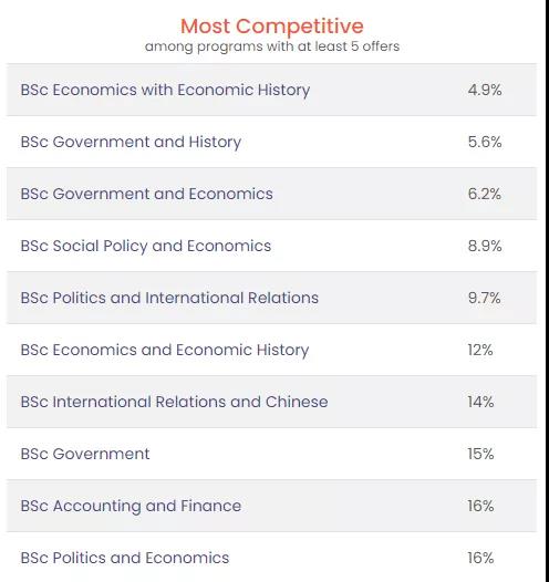 本科41个专业,LSE的申请难度都高。根据LSE 发布的录取数据,我们不难看出跟经济学相关的专业竞争都异常激烈。