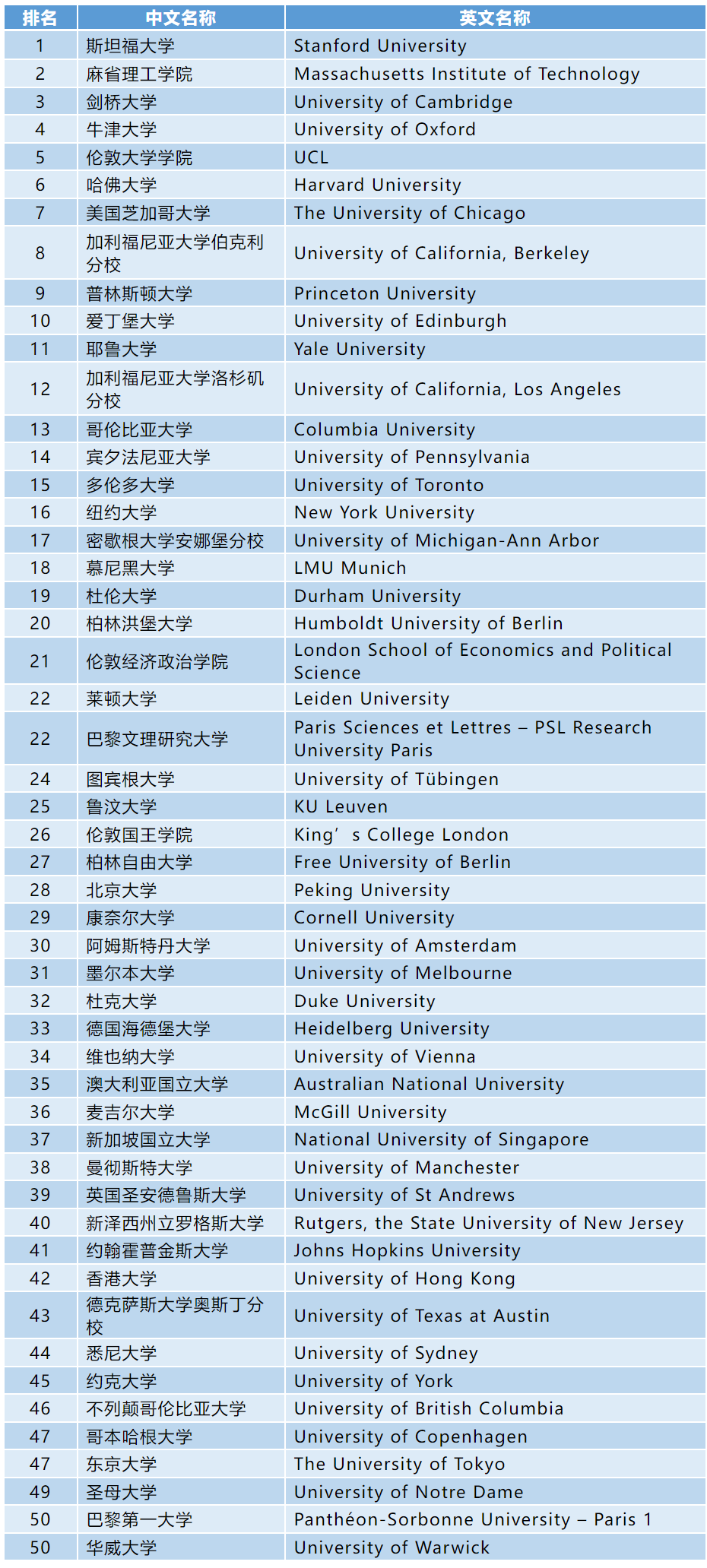 艺术与人文学科TOP50榜单