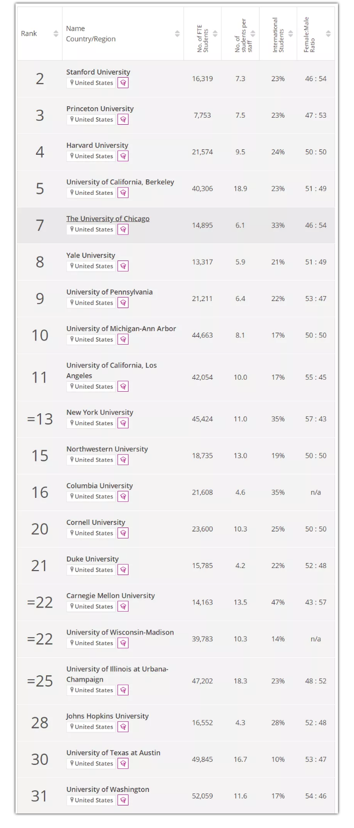 2022THE世界大学心理学专业(TOP20美国大学)排名