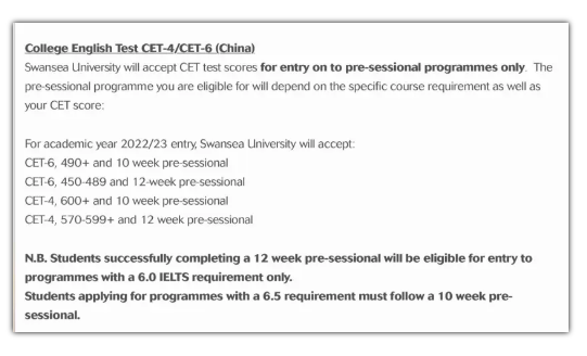 斯旺西大学也接受四六级成绩,但仅用于申请语言班,需要参加的语言班将取决于具体的课程要求。
