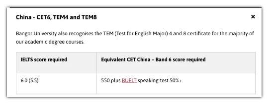 班戈大学接受六级成绩申请大部分课程。主课程需要雅思 6 分,小分 5.5 等同于英语六级 550 +。还需要参加班戈大学的口语测试,要求 50%以上。
