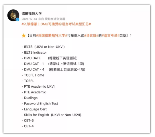 去年年底,德蒙福特大学在官方微 博宣布:下一学年,继续接受四六级成绩等其他的语言考试成绩作为入读语言班的语言能力证明。