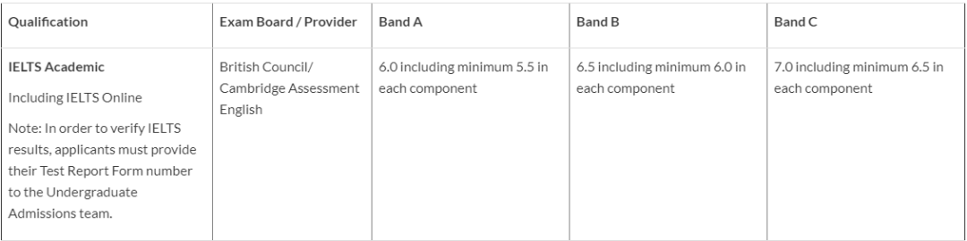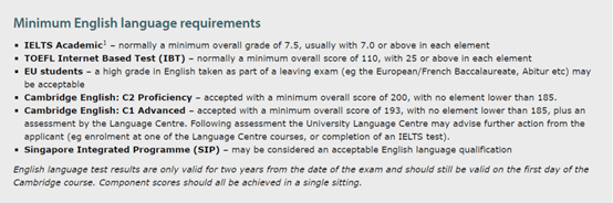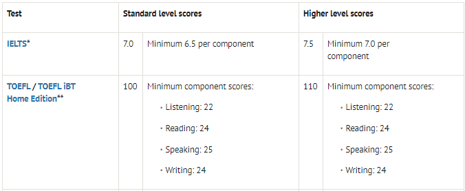 IELTS:7.0+,单项不低于6.5分;建议IELTS:7.5+单项不低于7.0;