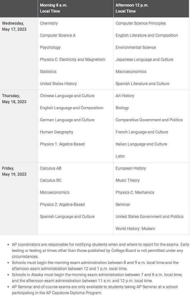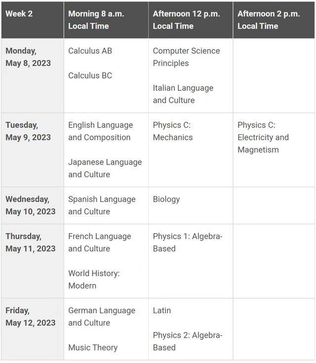 考试科目:微积分AB、微积分BC、计算机科学原理、意大利语言文化、英语写作、日语文化、物理C:力学、物理C:电磁学、西班牙语言文化、生物、法语文化、世界史、物理1:代数基础、德语文化、音乐理论、拉丁语、物理2:代数基础