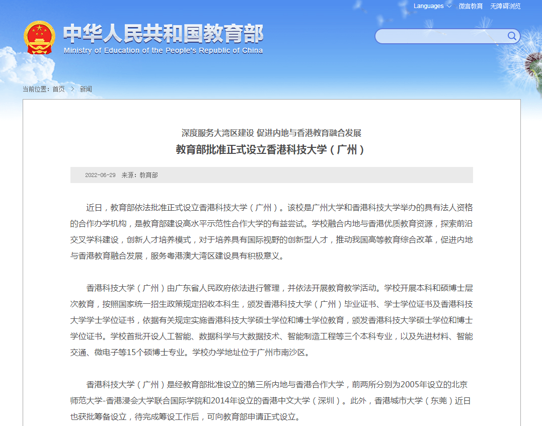 近日,教育部依法批准正式设立香港科技大学(广州)。该校是广州大学和香港科技大学举办的具有法人资格的合作办学机构,是教育部建设高水平示范性合作大学的有益尝试。学校融合内地与香港优质教育资源,探索前沿交叉学科建设,创新人才培养模式,对于培养具有国际视野的创新型人才,推动我国高等教育综合改革,促进内地与香港教育融合发展,服务粤港澳大湾区建设具有积极意义。