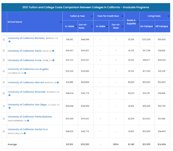 在加州的研究生,州外学生平均学杂费为每年$26,383,校外住宿费平均为每年$14,404。以加州系大学为例,不同学校的学杂费区别不大,但是住宿费与学校所在城市生活水平有关。其中,加州大学伯克利分校的住宿费最 高,校内住宿费为每年$20,530,校外住宿费为每年$15,638。