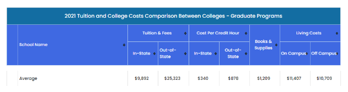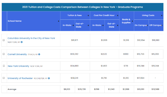 在纽约州的研究生,州外学生平均学杂费为每年$29,726,平均校外住宿费为每年$13,588。而中国学生热门院校如哥伦比亚大学,纽约大学,康奈尔大学,罗切斯特大学都是私立院校,学费相对较高。哥大和纽大由于位于纽约市,住宿费也相对较高了。