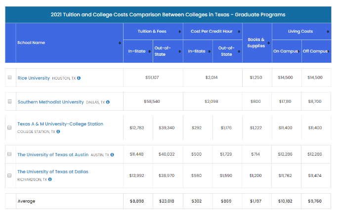 在得克萨斯州的研究生,州外学生平均学杂费为每年$23,018,平均校内住宿费为每年$10,182,平均校外住宿费为每年$9,780。得克萨斯州位于美国的南部,生活成本相对低廉。