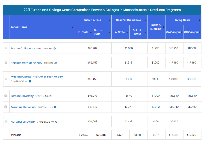 在马萨诸塞州的研究生,州外学生平均学杂费为每年$36,386,平均校内住宿费为每年$15,020,平均校外住宿费为每年$12,330。其中,东北大学和波士顿大学的校内外住宿费基本保持一致,而麻省理工学院的校外住宿费用则外校内住宿的2倍。