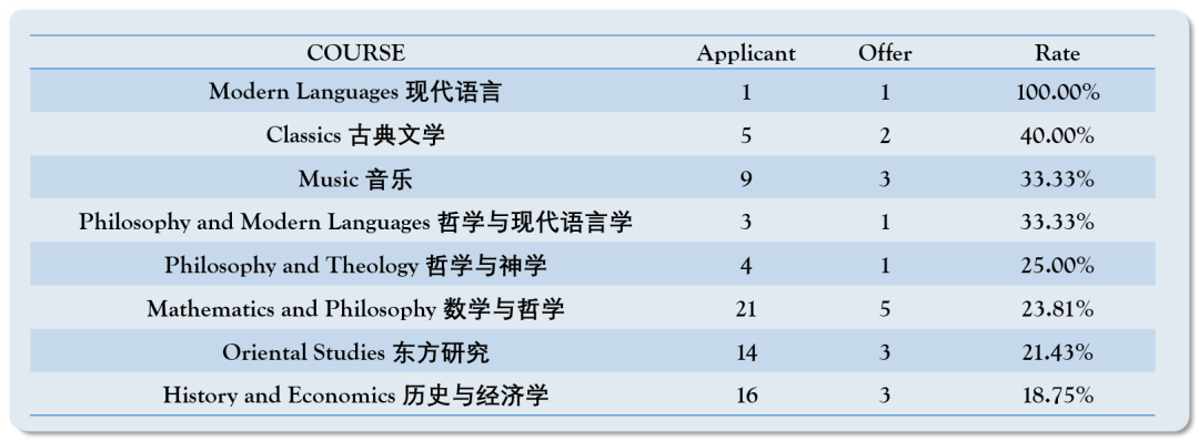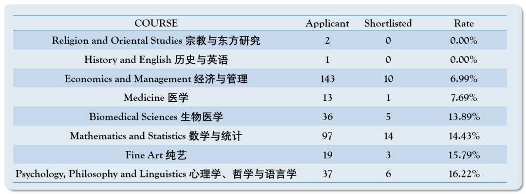 在牛津的申请中,每年能够拿到面试邀请,已经可以算“成功一半”了;众多专业中,社科类方向及医学属于面试率最低的两大主类,代表专业分别是宗教与东方研究及经济与管理。