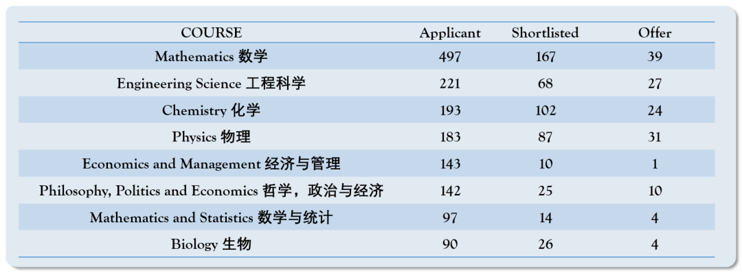 中国学生申请人数最多的专业为数学专业(QS学科排名全英第2,世界第6),约497名中国申请者递交了申请,有167人拿到面试邀请,发放offer约为39封,录取率约为7.84%;