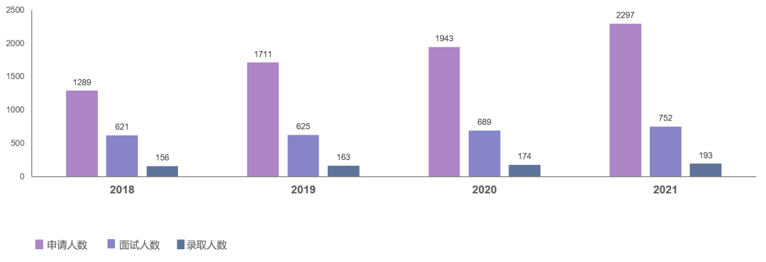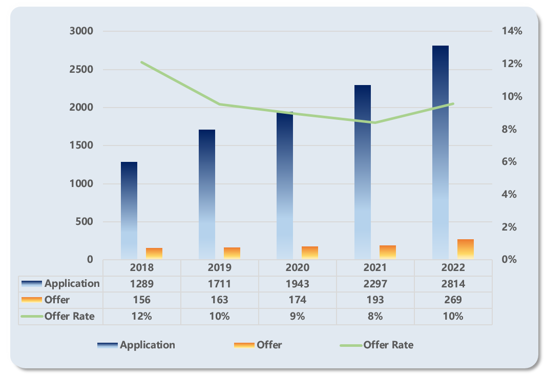 据官网公开数据,2021年牛津一共收到24,338人递交的申请,其中3,555人收获offer,3,298人获得最终录取。从2017到2021年,牛津申请竞争更加的激烈,五年间申请人数一直呈现上升的趋势,总增长率为22%。