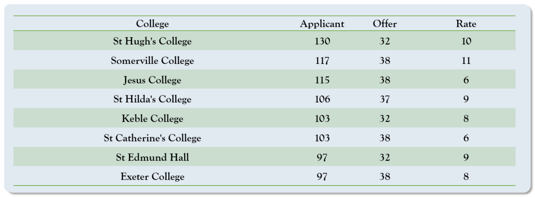 对中国大陆申请者,录取率最低的两个学院分别为Regent‘s Park College、Wycliffe Hall