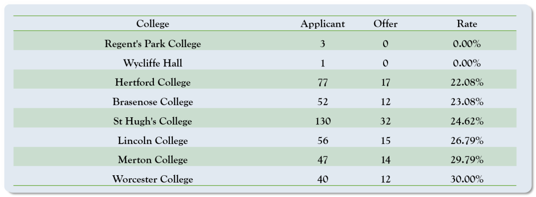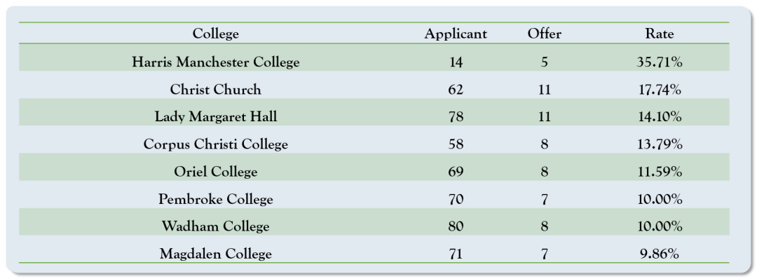 对中国大陆申请者,录取率最 高的两个学院分别为Harris Manchester College、Christ Church;但需要注意Harris Manchester College只招收21周岁以上的学生