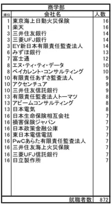 商科就业率非常可观,除了继续深造硕士博士的学生外,有 872 名毕业生选就职,其中 226 名,近四分之一的人都进入了以下日本TOP企业。
