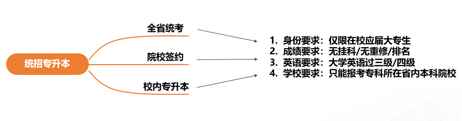 第二种专科生可以选择先专升本再升硕。我们以统招专升本为例,通过下图可以看到,专升本对于专科生的限制条件也很多,比如仅限应届大专生报名,只限省内报考,成绩和英语成绩也都有要求等等。