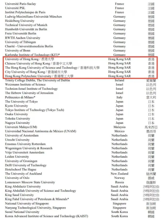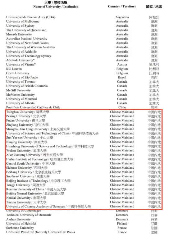 名单院校由199所扩增至200所。其中,删除了巴黎综合理工学院(法国)、弗莱堡大学(德国)等4所欧洲高校,并新加入了阿德莱德大学(澳大利亚)、米兰理工大学(意大利)等5所院校。在此次变动中,中国内地及中国香港的上榜高校无变化。